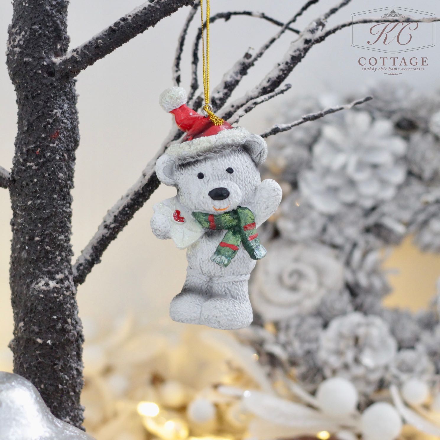Adorable pair of two little festive bear hanging decoration for your christmas tree! This is a solid resin light grey bear, with a red Santa hat, green and red scarf holding a little love letter and waving! As pictured this bear can be left free standing too an an ornament! The choice is yours!